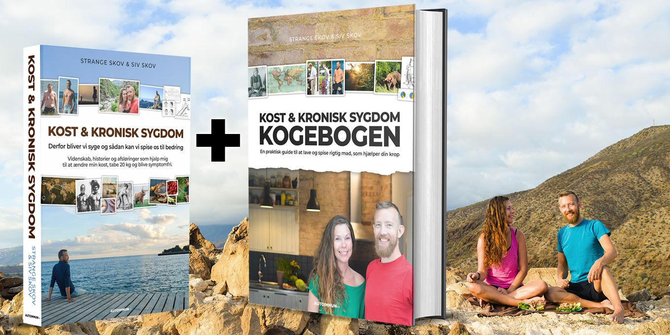 Få begge bøgerne, både vores første bog ‘Kost & Kronisk sygdom’ + vores store kogebog, som er vores praktiske guide til dig med kronisk eller autoimmun sygdom, som gerne vil have det bedre ved at spise bedre.